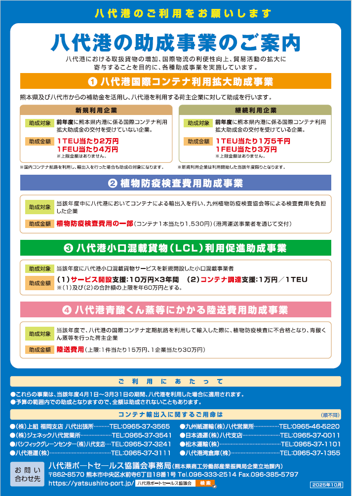 八代港における取扱い貨物の増加、国際物流の利便性向上、貿易活動の拡大に寄与することを目的に、各種助成事業を実施しています。